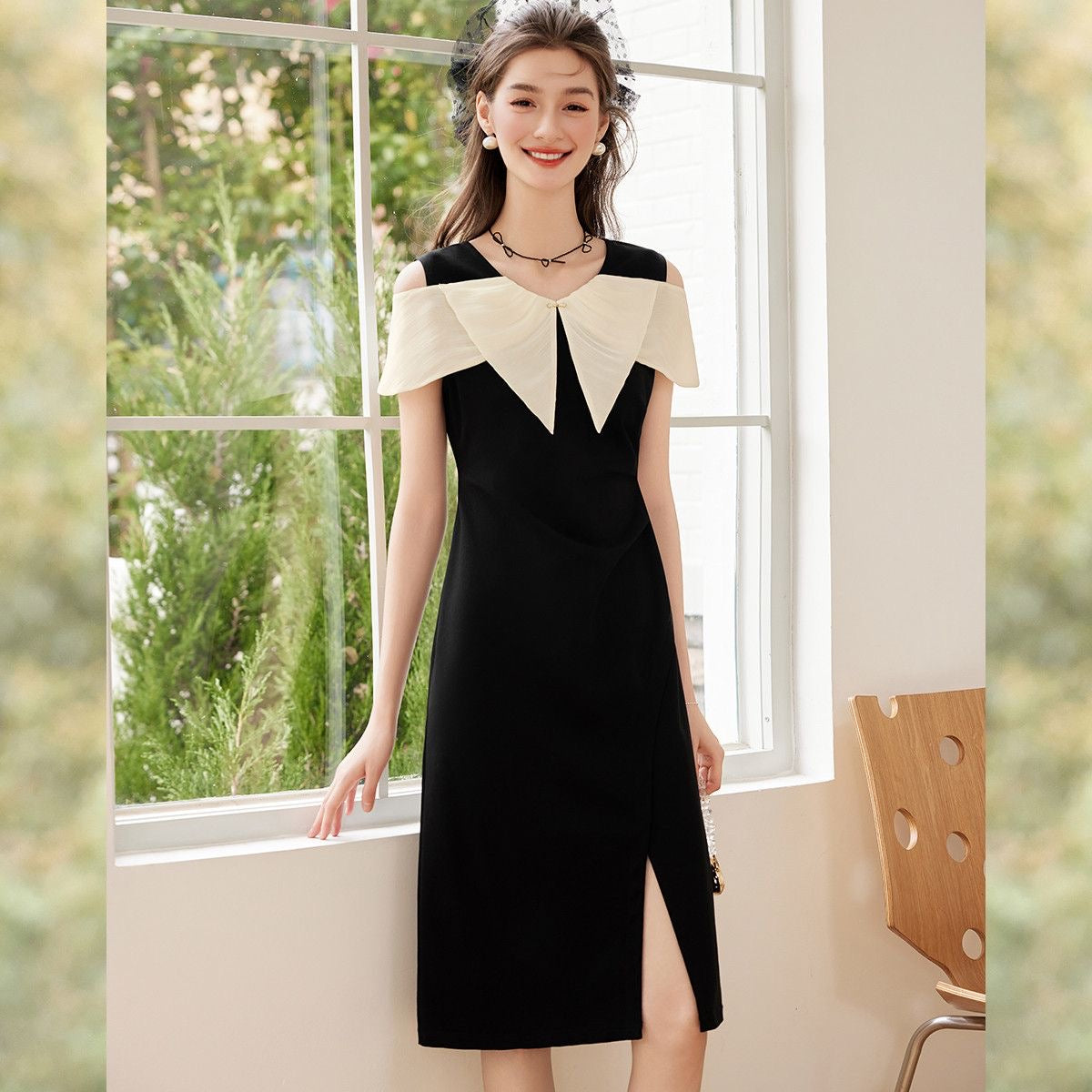 ✨ オフショルダーVネックで魅せる、大人のセクシー 立体感あるパネル拼接が気品をプラス! 脚元に軽やかさを添えるスリットデザイン |